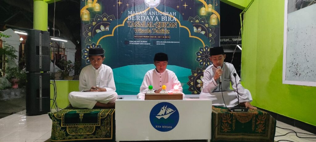 www.desabira.com – Desa Bira menggelar kegiatan Malam Anugerah Berdaya Bira yang dirangkaikan dengan Tasmi’ Al-Qur’an Wisuda Tahfidz pada Rabu malam, 31 Desember 2025. Kegiatan ini berlangsung di pelataran Masjid Jami Dusun Birakeke, Desa Bira, setelah salat Isya sebagai bentuk pengapresiasian Pemerintah Desa kepada para santri Pesantren Wisata (Pesanta) yang telah menyelesaikan hafalannya.