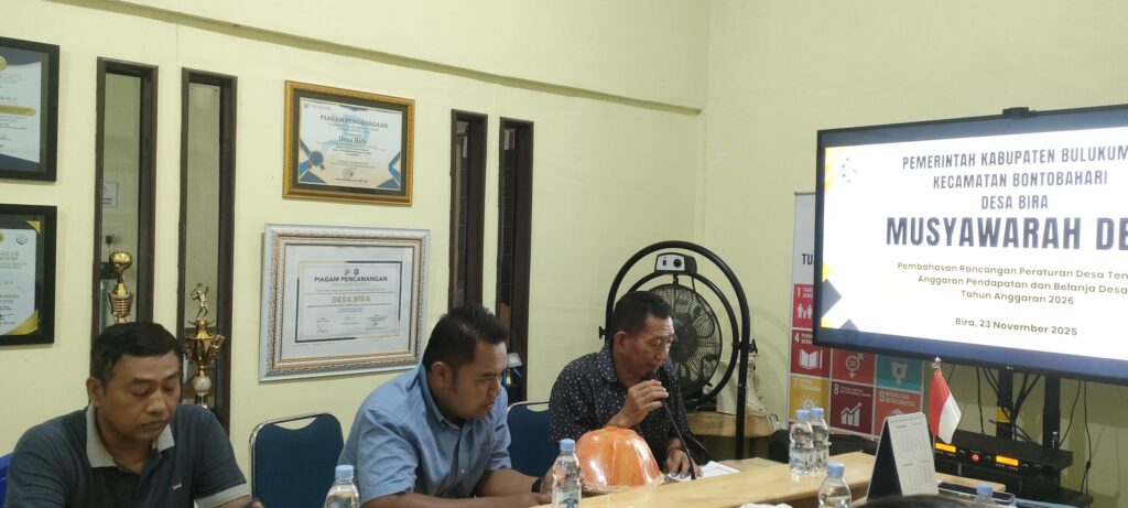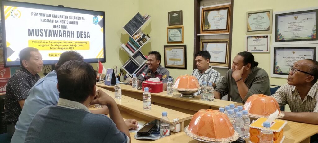 www desabira.com — Pemerintah Desa Bira menggelar Musyawarah Desa (Musdes) Pembahasan Rancangan Peraturan Desa (Ranperdes) tentang APBDes Tahun Anggaran 2026, bertempat di ruang rapat Kantor Desa Bira, Minggu, 23 November 2025, pukul 09.00 WITA.